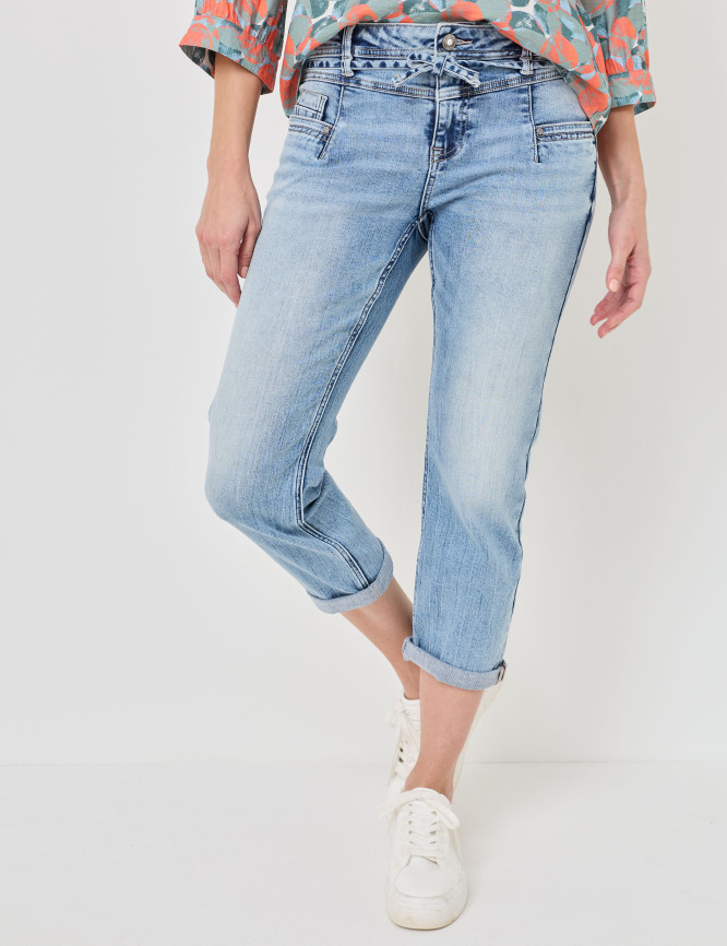 - Seitliche Eingriff- und Gesäßtaschen mit Ziernähten und Nieten