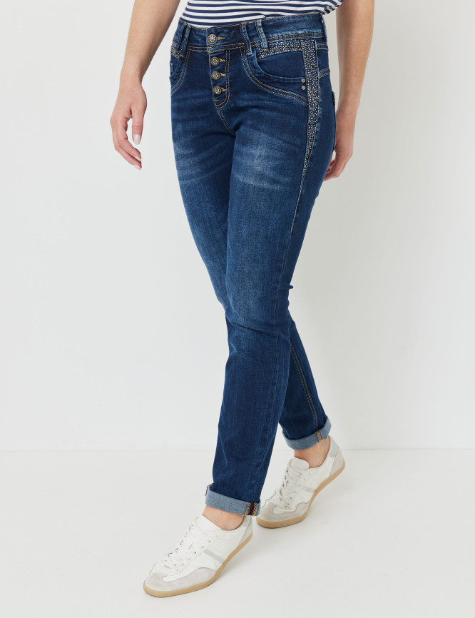 - Seitliche Eingriff- und Gesäßtaschen mit Ziernähten und Nieten